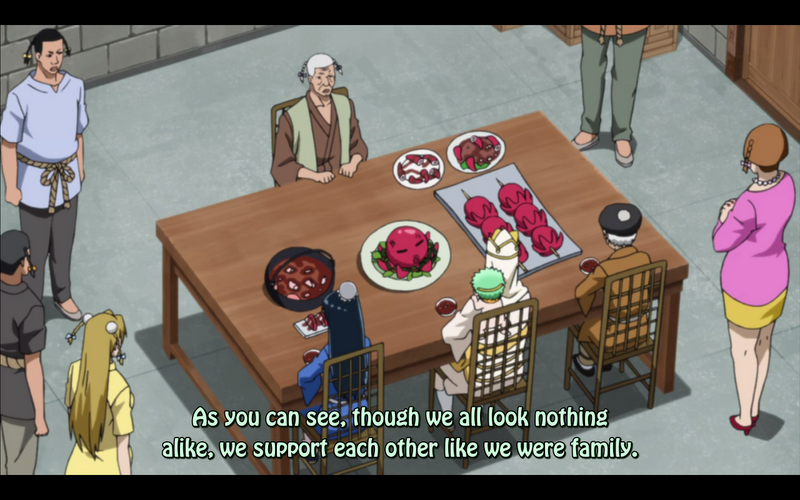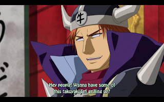 After being attacked by several characters from the show, playing characters from the tale Journey to the West, Oga and group find their way to a village of Shiroyamas. They tell them that the Ox King’s bandits are stealing their crop of octopi. Oga and the other three take care of the bandits, but the octopi are all fried in Beel’s lightning.