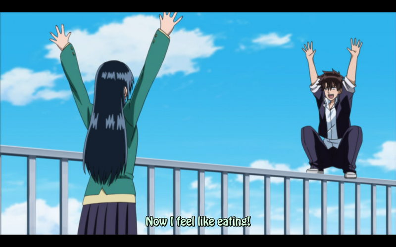 After Beel pisses Kanzaki off, he runs out of the classroom after smelling something. He runs right towards Aoi, and tackle hugs her. At first she freaks out over the unexpected show of affection from Oga, but as all good love interests she immediately catches on that something isn’t quite right.